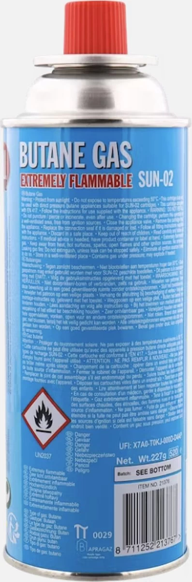 Gasbus van het merk All-ride gevuld met butaan. Wegwerp fles, niet geschikt voor navullen.