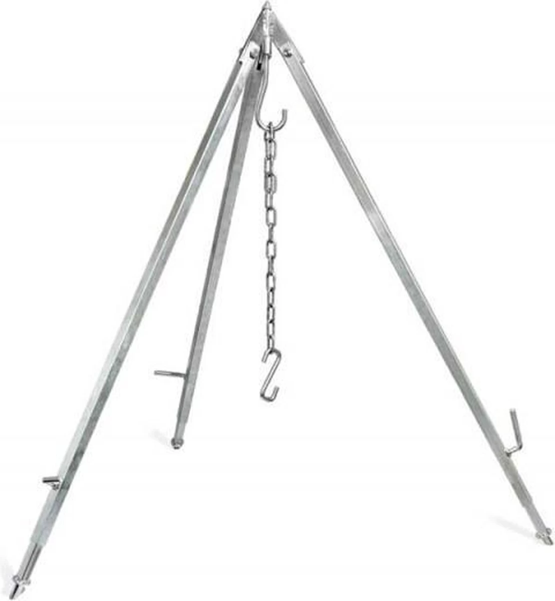 Een zeer stabiele 3-poot. Deze 3-poot is ideaal om de Dutch Oven aan te bevestigen en de pan vervolgens boven het vuur op te hangen. Beschikt over verstelbare poten, zodat deze ook op een ongelijke ondergrond stabiel kan worden afgesteld. De driepoot kan op verschillende hoogtes worden afgesteld. Ook geschikt om met andere pannen te koken boven een kampvuur.